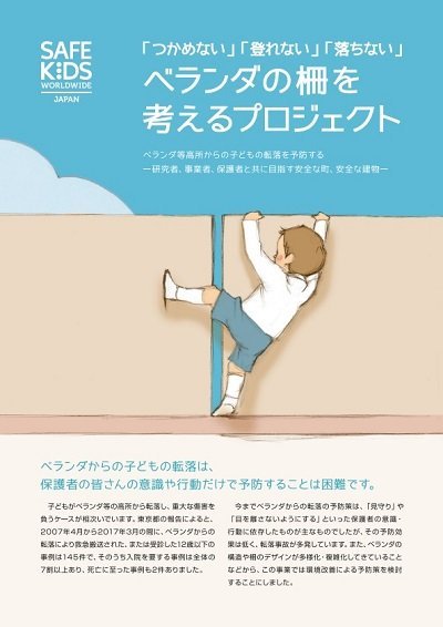 ベランダの柵を考えるプロジェクト 一般向けSKJ Safe Kids Japanでは、2020年10月から2022年3月にかけて、「子どものベランダ等高所からの転落予防事業」を行ってきました。これは公益財団法人 三菱財団の助成により実施したものです。 この度、この事業を通じてわかったことや新たな予防策についてまとめたリーフレットを作成しました。どなたでも自由にダウンロードしていただけますので、どうぞご活用ください。 PDFダウンロード