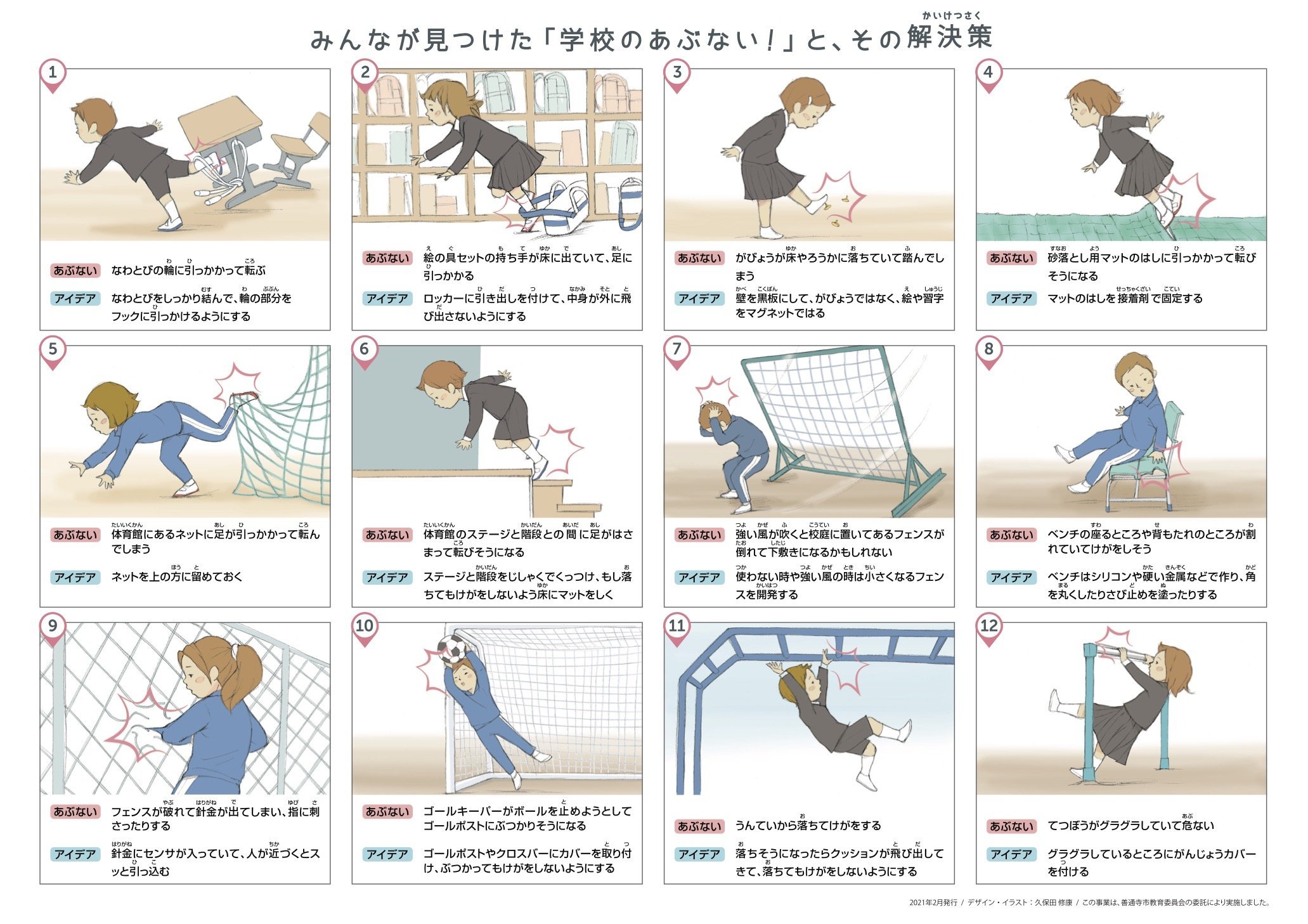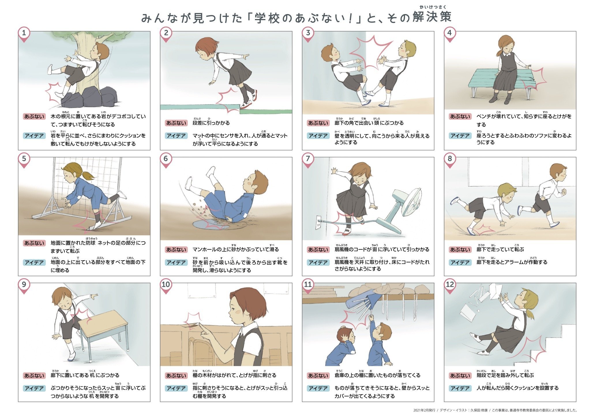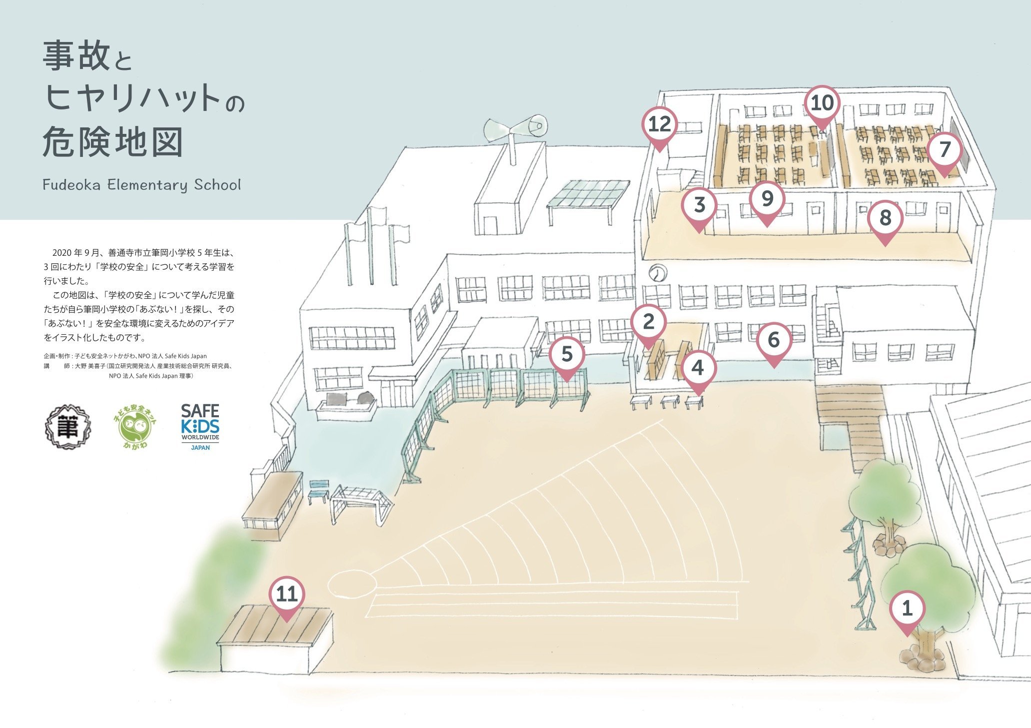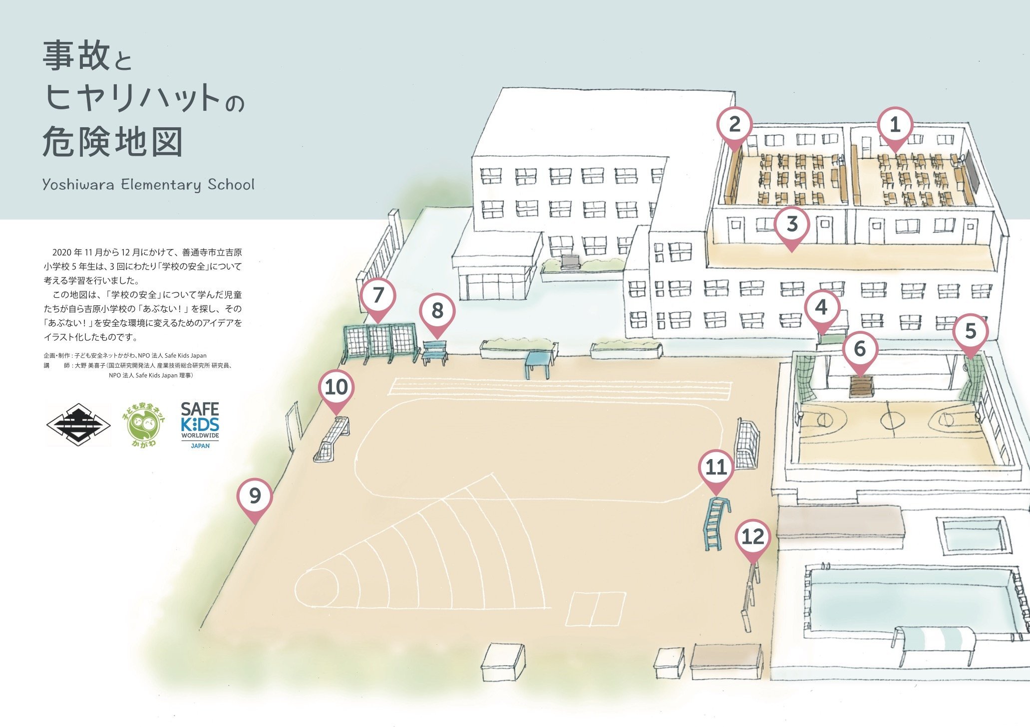 その「あぶない!」とアイデアは「事故とヒヤリハットの危険地図」にまとめて各小学校の全校児童に配布、子ども達や先生方、保護者の方、そして地域の方が継続的に学校とその周辺の安全について考えるために活用していただいています。
