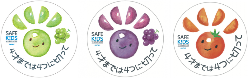 Safe Kids Japanでは、ミニトマトや大粒のぶどうなどによる窒息を予防することを目的に、食材を提供する事業者の方々を通じて一般消費者の皆さんに安全な食べ方をご紹介したいと考え、シールとチラシを作成しました。