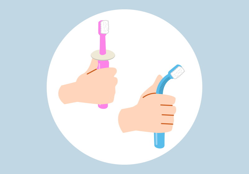 特に歩行が安定しない1~2歳児は転倒しやすいので、座って歯みがきをすることを習慣化しましょう。 歯ブラシは柄の一部が柔らかくなっていて曲がるものや、先端が喉に届かないように持ち手につばが付いているもの、持ち手がリング状になっているものなどを選びましょう。