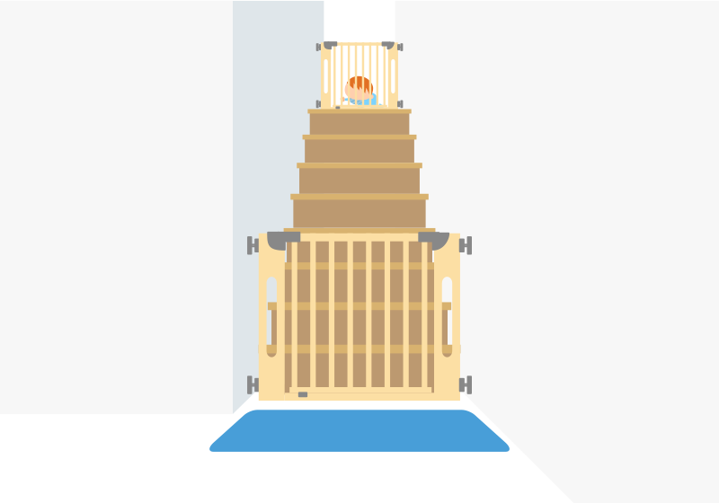 階段の上にも下にもベビーゲートを付け、必ずロックをし、子どもが勝手に階段内に入れないようにしましょう。